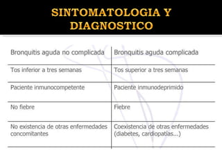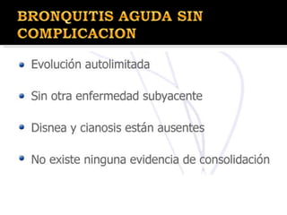 La bronquitis aguda es la inflamación aguda de la mucosa bronquial y la hipersecreción de las glándulas mucosas de los bronquios, que generalmente dura de 1 a 3 semanas. Los síntomas principales son la tos, que a menudo produce esputo, y puede estar acompañada de fiebre, dolor retroesternal y disnea. La bronquitis aguda suele ser el resultado de infecciones virales de las vías respiratorias superiores, aunque en algunos casos puede deberse a bacterias o irritantes.