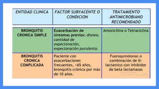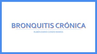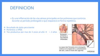 Este documento describe la bronquitis crónica, una inflamación crónica de las vías respiratorias que afecta principalmente a fumadores y personas expuestas a irritantes. Define la bronquitis crónica, discute su epidemiología, etiología, síntomas, diagnóstico y tratamiento. Explica que se caracteriza por tos productiva por más de 3 meses al año durante dos años consecutivos, y su tratamiento incluye dejar de fumar, broncodilatadores, antibióticos y otros medicamentos.