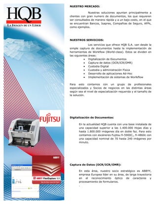 HQB S.A. es una compañía que ofrece servicios de digitalización, captura y custodia de documentos. Fue fundada por profesionales con experiencia en procesamiento de imágenes provenientes de compañías como Unisys y Kodak. Sus servicios incluyen la digitalización de documentos, captura de datos, custodia digital, desarrollo de aplicaciones y sistemas de workflow. Sus objetivos son garantizar la calidad y uniformidad de los resultados minimizando riesgos a través del control y anticipación de errores.