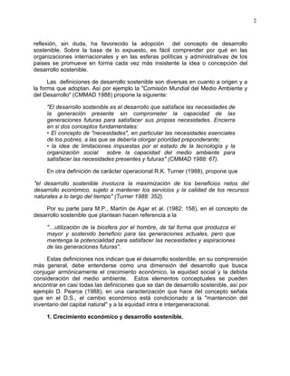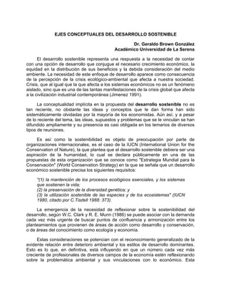 El documento discute los ejes conceptuales del desarrollo sostenible. Explica que el desarrollo sostenible busca armonizar el crecimiento económico, la equidad social y la protección ambiental. También analiza la relación entre el crecimiento económico y el desarrollo sostenible, señalando que el crecimiento económico puede tener efectos positivos en el medio ambiente cuando se logra satisfacer las necesidades básicas de la población y mejorar la eficiencia productiva. Sin embargo, los modelos de desar