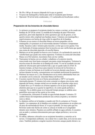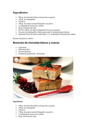 Este documento proporciona una receta para brownies de chocolate blanco y nueces. La receta incluye ingredientes como chocolate blanco, mantequilla, huevos, azúcar, harina y nueces. La preparación implica derretir el chocolate y la mantequilla, luego batir los huevos con azúcar y mezclarlos con la mezcla de chocolate. A continuación, se añade la harina tamizada y las nueces a la mezcla. La masa se hornea a 180°C durante 35 minutos y luego se enfría antes de cortarla en porcion