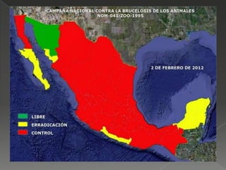 La brucelosis es una enfermedad infecciosa causada por bacterias del género Brucella que afecta a humanos y varias especies de mamíferos. Es una zoonosis importante en México transmitida principalmente de cabras y ovejas a humanos a través del consumo de leche y queso no pasteurizados. Los síntomas en humanos incluyen fiebre, fatiga, dolores musculares y articulares.