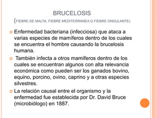 La brucelosis es una enfermedad bacteriana que infecta varias especies de mamíferos incluyendo humanos. Es causada por la bacteria del género Brucella, siendo las especies B. melitensis, B. abortus, B. suis y B. canis las que infectan humanos. Las personas se contagian principalmente por el consumo de leche cruda o derivados no pasteurizados, o por contacto directo con tejidos o fluidos de animales infectados. Los síntomas incluyen fiebre, dolores musculares y articulares. El
