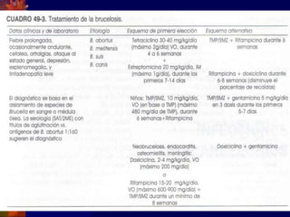 La brucelosis es una enfermedad zoonótica causada por bacterias del género Brucella que infectan principalmente a animales domésticos. Los seres humanos se infectan principalmente a través del contacto directo con animales enfermos o el consumo de productos lácteos contaminados. La brucelosis puede causar una variedad de síntomas como fiebre, dolores musculares y articulares, así como localizaciones específicas como sacroilitis, espondilitis y orquiepididimitis. El diagnóstico se real