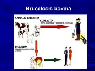 La brucelosis es una enfermedad infecciosa importante en la salud pública y animal que afecta principalmente a bovinos, causando abortos y retención de placenta. Es causada por la bacteria Brucella, la cual ingresa al organismo vía oral y se disemina a los órganos reproductivos y glándulas, donde causa abortos en hembras y orquitis en machos. El diagnóstico se realiza mediante pruebas serológicas y aislamiento bacteriano, mientras que el tratamiento consiste en el uso de antibiótic