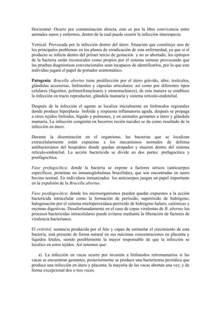 Este documento describe la brucelosis bovina, una enfermedad infecciosa causada por la bacteria Brucella abortus que afecta principalmente al ganado lechero. Provoca abortos e infertilidad en las vacas, lo que causa grandes pérdidas económicas. Se transmite entre el ganado a través del contacto directo o de la ingesta de productos infectados como leche cruda o fetos abortados. Los principales signos son abortos en las últimas etapas de la gestación en las vacas y orquitis en los toros. El