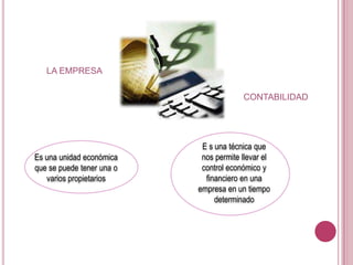 La contabilidad es una técnica que permite llevar el control económico y financiero de una empresa. Los documentos contables incluyen comprobantes de venta, retención de impuestos, y otros documentos autorizados que sustentan las transacciones. Los libros contables principales son el diario y el mayor, y los procesos contables generan estados financieros como el balance general y estados de resultados.