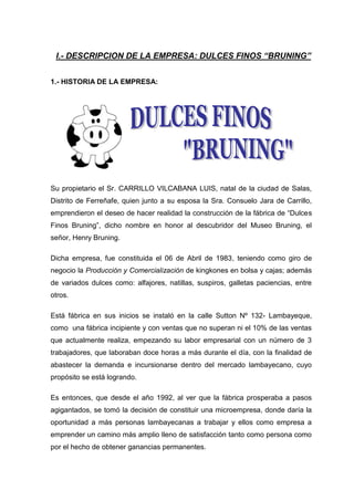 1. La empresa Dulces Finos "Bruning" fue fundada en 1983 por el Sr. Carrillo Vilcabana Luis y su esposa en Lambayeque. Inició con 3 empleados y ha crecido a 20 empleados en la actualidad.