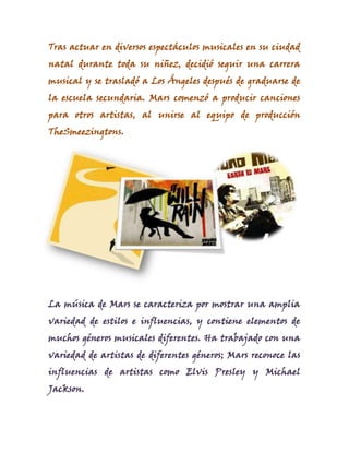 Bruno Mars es un cantante y compositor estadounidense nacido en 1985 en Honolulu, Hawaii. Criado en una familia de músicos, Mars comenzó a actuar y hacer música desde una edad temprana. Tras graduarse, se mudó a Los Ángeles para seguir una carrera musical donde comenzó a producir canciones para otros artistas. La música de Mars se caracteriza por mostrar una amplia variedad de estilos e influencias de diferentes géneros musicales.