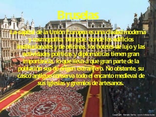 Bruselas es la capital de Bélgica y de la Unión Europea. Es una ciudad moderna y cosmopolita con edificios institucionales y de oficinas, pero su casco antiguo conserva su encanto medieval. Además de ser sede de las instituciones de la UE y la OTAN, Bruselas acoge muchos congresos internacionales y es un importante centro financiero.