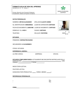 Este documento presenta un formato de hoja de vida para un aprendiz que incluye secciones para datos personales, estudios, experiencia laboral, estudios complementarios, período de formación y referencias personales. El formato pide información como nombres, identificación, fecha de nacimiento, domicilio, teléfono, estudios primarios, secundarios y otros, último cargo y empresa laboral, especialidad y código de estudios complementarios, fechas de inicio y fin de la etapa lectiva, y duración de la etapa productiva en horas o meses.