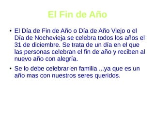 El documento describe las tradiciones de fin de año. Se celebra el 31 de diciembre para recibir el nuevo año con alegría en familia. Una costumbre es tomar doce uvas, una por cada campanada a medianoche, que se originó en España debido a un exceso de uvas. Luego de las uvas y un brindis, la gente llama o envía mensajes a sus seres queridos para desearles feliz año nuevo.