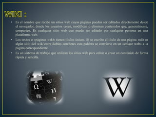 El documento describe lo que es un wiki, que permite que los usuarios creen y editen contenido de forma colaborativa en sitios web. Explica que Wikipedia es la aplicación wiki más famosa y que los wikis mantienen un historial de cambios. También define qué es un blog, cómo se actualizan con frecuencia y permiten comentarios de lectores. Finalmente, resume SlideShare como un sitio para compartir presentaciones que fue adquirido por LinkedIn para profesionalizar su uso.