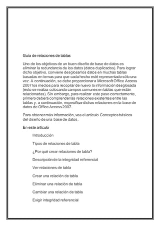 1. El documento describe las relaciones entre tablas en una base de datos y cómo estas ayudan a combinar información de varias tablas sin duplicar datos.