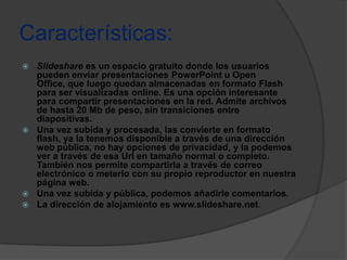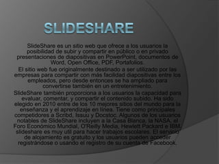 SlideShare es un sitio web que permite a los usuarios compartir presentaciones de PowerPoint, documentos de Word y PDF de manera pública o privada. Originalmente destinado a compartir diapositivas entre empresas, ahora también se usa para entretenimiento. Los usuarios pueden evaluar, comentar y compartir contenido subido. SlideShare es popular para trabajos escolares debido a su alojamiento gratuito y acceso a través de Facebook.