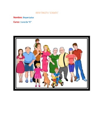 Este documento presenta los datos personales de Bryan Luisa Chango, un estudiante de 15 años. Detalla su familia nuclear incluyendo a sus padres, hermanas y hermano, así como varios familiares extendidos como abuelos, tíos, primos y tías.