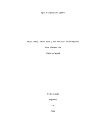 Este documento describe diferentes tipos de organizadores gráficos como PowToon, Canva, Visme, Swipe, Prezi, Genially y líneas de tiempo. Para cada uno, brinda una breve descripción de sus características y funcionalidades, así como ejemplos de su uso a través de enlaces de YouTube. El objetivo es informar sobre herramientas que permiten crear presentaciones, infografías y otros contenidos visuales de manera sencilla.