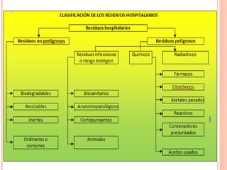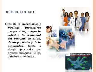 El documento habla sobre los principios básicos de bioseguridad en el ámbito hospitalario. Explica que la bioseguridad incluye medidas para proteger la salud del personal y pacientes de riesgos biológicos, físicos, químicos y mecánicos. Describe precauciones universales como el lavado de manos, uso de barreras de protección y manejo seguro de objetos punzantes y desechos hospitalarios. También menciona la clasificación y eliminación adecuada de residuos generados en centros de salud.