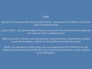 El documento describe una tarea de búsqueda en la base de datos Scopus para encontrar 5 artículos publicados en los últimos 5 años sobre cómo la higiene bucal y el consumo de chucherías afectan la aparición de caries en niños y adolescentes. La estrategia de búsqueda se realiza en Scopus y los artículos se exportan a Mendeley, donde se crea la bibliografía en formato Vancouver para incluirla en un blog con capturas de pantalla del proceso de búsqueda y creación de la bibliografía.