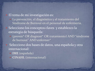 Este documento describe los pasos que Esther Ma Gil Rees siguió para realizar una búsqueda bibliográfica sobre la prevención, diagnóstico y tratamiento del síndrome de burnout en el personal de enfermería en dos bases de datos, una española (IME) y otra internacional (CINAHL). Esther desarrolló una estrategia de búsqueda utilizando términos clave y realizó varias búsquedas en ambas bases de datos, obteniendo diferentes números de resultados y creando una alerta en CINAHL para recibir actual