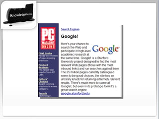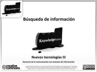 El documento aborda la búsqueda de información y la gerencia de la comunicación con sistemas de información, destacando principios clave como colaboración y generosidad. También se mencionan diferentes motores de búsqueda y técnicas para mejorar la eficiencia de las búsquedas en línea. Se incluye un reto sobre la investigación de herramientas de análisis de información y su documentación en un blog del curso.
