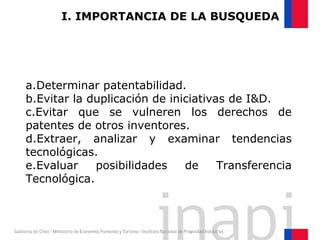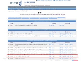 La búsqueda de patentes es clave para determinar la patentabilidad, evitar la duplicación de iniciativas y no vulnerar derechos de otros inventores. Se presenta un procedimiento para obtener un extracto termoestable con propiedades antioxidantes y pro cicatrizantes a partir de microalgas, destacando la importancia de realizar una búsqueda acotada del estado del arte mediante diversas herramientas y clasificaciones de patentes. Esta metodología permite evaluar posibilidades de transferencia tecnológica y analizar tendencias del sector.