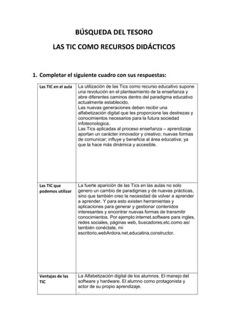 Este documento describe las Tecnologías de la Información y la Comunicación (TIC) como recursos didácticos valiosos en el aula. Explica que las TIC pueden revolucionar la enseñanza al hacerla más dinámica e interactiva. También destaca que las nuevas generaciones necesitan alfabetización digital para desarrollar habilidades para la sociedad del futuro. Aunque las TIC tienen ventajas como motivar a los estudiantes y fomentar la autonomía, también conllevan desventajas como la distracción.