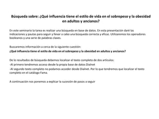 Este documento proporciona instrucciones para realizar una búsqueda en una base de datos sobre la influencia del estilo de vida en el sobrepeso y la obesidad en adultos y ancianos. Explica el uso de operadores booleanos y palabras clave para una búsqueda eficaz. Se deben localizar el texto completo de dos artículos relevantes, uno accesible directamente en Dialnet y el otro en el catálogo Fama.