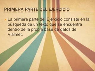 Este documento proporciona instrucciones para realizar una búsqueda bibliográfica sobre la influencia del estilo de vida en el sobrepeso y la obesidad en adultos utilizando la base de datos Dialnet. Explica cómo acceder a Dialnet a través de la biblioteca universitaria, realizar una búsqueda con criterios específicos, y seleccionar un artículo completo. También describe cómo buscar un artículo que no esté disponible en Dialnet a través del catálogo FAMA para obtener el texto completo.