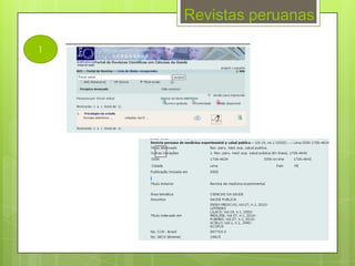 Este documento presenta una guía sobre cómo realizar búsquedas en la Biblioteca Virtual de Salud (BVS) de Perú. Explica cómo encontrar revistas peruanas especializadas en psicología y ginecología utilizando operadores booleanos como "AND", "OR" y "AND NOT" para realizar búsquedas más específicas sobre temas como "Cáncer 2012-2013".