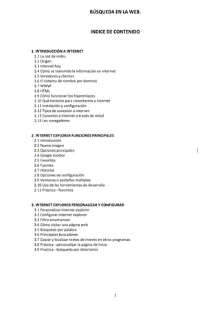 El documento proporciona una introducción a Internet, describiendo su origen, cómo funciona y su evolución a lo largo del tiempo. Se abordan temas clave como la transmisión de información, el sistema de nombres de dominio, los servidores y clientes, así como el uso de navegadores web. Además, se destacan los cambios significativos en el acceso y la comunicación facilitados por Internet, subrayando su impacto en la sociedad moderna.