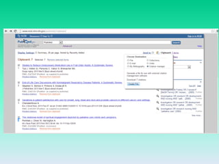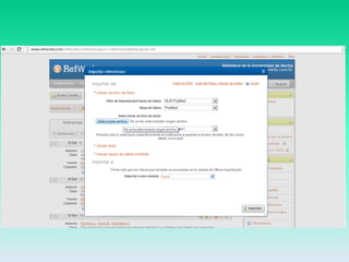 Este documento proporciona instrucciones sobre cómo realizar búsquedas en PubMed y crear referencias bibliográficas en RefWorks. Explica cómo crear una cuenta en PubMed y RefWorks, realizar búsquedas utilizando palabras clave y operadores lógicos como AND, OR y NOT, y descargar y exportar artículos a RefWorks para generar una bibliografía.