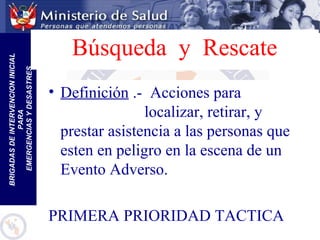 El documento describe las brigadas de intervención inicial para emergencias y desastres, enfocándose en las tareas de búsqueda y rescate. Explica que la búsqueda y rescate busca localizar y asistir a personas en peligro, y es la prioridad táctica inicial. También describe los métodos y procedimientos para realizar búsqueda y rescate en estructuras colapsadas e incendios.
