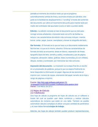 Este documento describe el uso de software de oficina como procesadores de palabras y hojas de cálculo. Explica cómo crear, editar, dar formato e imprimir documentos en un procesador de palabras, así como cómo crear, editar, imprimir y manipular datos en una hoja de cálculo. También proporciona definiciones y ejemplos de cómo utilizar las funciones básicas de estos tipos de software.