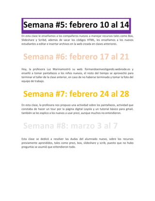 El documento resume las actividades realizadas en la clase de tecnología durante varias semanas. Se enfocaron en integrar a los nuevos estudiantes mediante actividades de trabajo en equipo y comprensión lectora. También se organizaron comités estudiantiles y se enseñó a los nuevos a usar herramientas digitales como Box, Slideshare y Scribd.