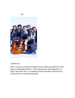 BTS es un grupo surcoreano formado en 2010 que debutó en 2013 bajo Big Hit Music. Está compuesto por siete integrantes que coescriben la mayoría de su material. A pesar de debutar en una industria dominada por grandes empresas, tuvieron éxito temprano cuando su primer sencillo alcanzó el puesto 14 en Billboard. Desde su debut en 2013 han lanzado 9 álbumes de estudio, 6 EPs y más de 250 canciones, muchas de las cuales escribieron ellos mismos.