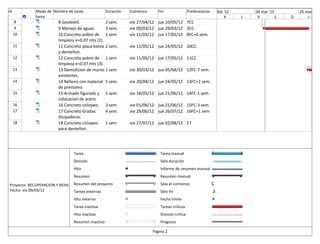 El documento describe un proyecto de 105 días para la recuperación y rehabilitación de una vía en Bucarasica que incluye 18 tareas como la excavación, el concreto, el relleno y la construcción de muros de contención, con fechas de comienzo y fin para cada tarea y sus predecesoras.
