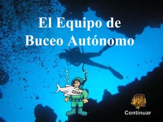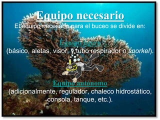 El documento describe el equipo necesario para el buceo autónomo, incluyendo piezas básicas como traje de buceo, máscara, aletas y cinturón de lastre, así como el equipo adicional requerido para buceo autónomo como botella de aire, regulador y chaleco. Explica cada pieza de equipo, sus características y funciones para asegurar la seguridad y comodidad del buzo bajo el agua.