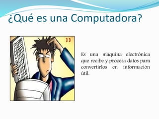 Una computadora es una máquina electrónica que recibe datos, los procesa y los convierte en información útil. Está compuesta de hardware, que son sus componentes físicos como el procesador, y software, que son los programas. El hardware incluye dispositivos de entrada como el teclado y ratón, y de salida como el monitor e impresora. El software incluye sistemas operativos y lenguajes de programación que permiten a la computadora funcionar.