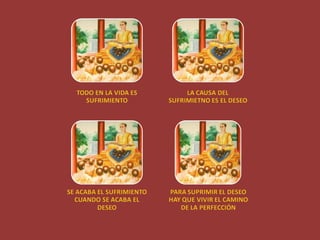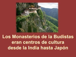 El budismo se originó en el siglo VI a.C. en la India con Siddhartha Gautama, quien tras experimentar el sufrimiento humano a través de la pobreza, enfermedad, vejez y muerte, renunció a su vida de lujo para buscar la iluminación. Después de años de prácticas ascéticas, alcanzó el estado de Buda bajo un árbol bodhi y descubrió las causas del sufrimiento y cómo alcanzar la liberación. El budismo luego se difundió por Asia entre los