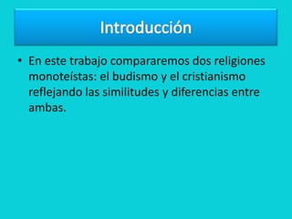 El documento compara el budismo y el cristianismo, resaltando que ambas son religiones monoteístas. El budismo sigue las enseñanzas de Buda para alcanzar la paz, mientras que el cristianismo sigue a Jesús y cree en Dios como deidad principal. Si bien comparten algunas similitudes como la oración y los libros sagrados, difieren en sus creencias sobre la vida después de la muerte y el origen del mundo.