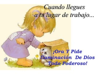 El documento ofrece consejos sobre cómo comportarse en el lugar de trabajo, enfatizando la importancia de la oración, la amistad, la sinceridad y la reflexión. Invita a actuar con fe, entusiasmo, perfección, fraternidad, tolerancia y humildad. Se culmina con un mensaje sobre la importancia de disfrutar cada día laboral como un regalo y no solo como un paso en la edad.