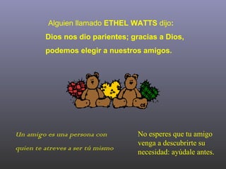 Este documento habla sobre la importancia y el valor de la amistad. Resalta que los amigos son personas con quienes puedes ser tú mismo y en quienes puedes confiar. Aunque a veces la distancia los separe, la amistad puede persistir a través del tiempo y las dificultades. Los amigos acompañan aunque no puedan ayudar directamente y su apoyo es fundamental para superar momentos difíciles.