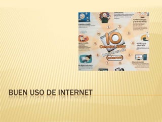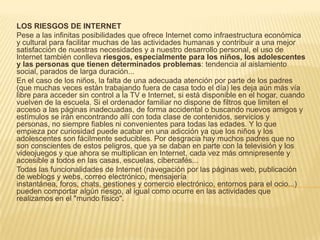 Internet ofrece muchas oportunidades pero también riesgos, especialmente para niños y adolescentes que pueden acceder a contenidos inadecuados sin supervisión. Los padres deben poner filtros y prestar atención para evitar la adicción o contacto con personas no fiables. Todos los usos de Internet como navegar, correo, chats o juegos en línea implican algún riesgo que requiere precaución.
