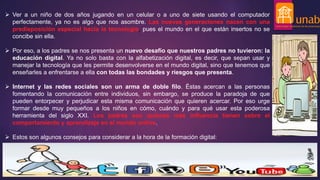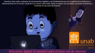 Este documento ofrece consejos para que los padres eduquen digitalmente a sus hijos y les enseñen a usar Internet de forma segura y saludable. Reconoce que las nuevas generaciones están familiarizadas con la tecnología desde pequeños. Recomienda establecer reglas sobre el uso y contenido adecuado para la edad, supervisar la navegación, enseñar sobre privacidad e identidad digital, y mantener un diálogo abierto para prevenir riesgos como el ciberacoso.