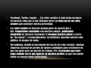 Este documento ofrece consejos sobre el buen uso de las redes sociales y la protección de la privacidad. Recomienda ser cuidadoso con la información y contenido que se publica, ya que esto puede afectar la reputación profesional e influir en futuros empleos. Además, aconseja mantener la vida profesional y personal separadas en las redes y no aceptar solicitudes de desconocidos.