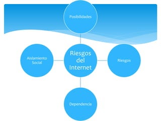 Este documento presenta los aspectos de seguridad y buen uso que se deben considerar al utilizar Internet, incluyendo los riesgos como la información poco fiable, comunicaciones ofensivas, estafas, y acceso a contenido inapropiado. También describe estrategias para un uso seguro como no compartir información personal, usar varios correos electrónicos, y pedir ayuda a los padres si alguien molesta. El objetivo es promover el uso confiable y seguro de Internet entre niños, jóvenes y sus familias.