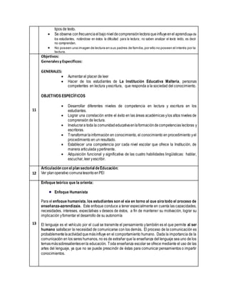 Este proyecto busca mejorar las habilidades de lectura y escritura de estudiantes, docentes y padres de familia a través de actividades como lectura diaria, debates, análisis de textos y elaboración de resúmenes. El proyecto se lleva a cabo en la Institución Educativa Maltería y utiliza recursos como bibliotecas, ludotecas e Internet. Se evalúa constantemente para verificar el cumplimiento de los objetivos y el impacto generado.