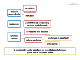 El documento presenta una experiencia práctica en atención a la diversidad, enfocándose en un congreso que destaca la importancia de no segregar a los estudiantes y de ofrecer oportunidades iguales. Se reporta un alto nivel de satisfacción entre el alumnado y sus familias, así como un notable éxito escolar en estudiantes en riesgo de abandono. La propuesta incluye la adaptación de contenidos y una mayor coordinación docente para mejorar los resultados académicos.