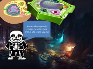 El documento habla sobre los diferentes tipos de células, incluyendo las células animales y vegetales. Describe que las células animales contienen lisosomas, cilios, flagelos, vacuolas, aparato de Golgi y ribosomas, mientras que las células vegetales contienen retículo endoplasmático, núcleo, gran vacuola, aparato de Golgi, mitocondrias, cloroplastos, pared celular y membrana plasmática. También menciona que las células solo pueden ser v